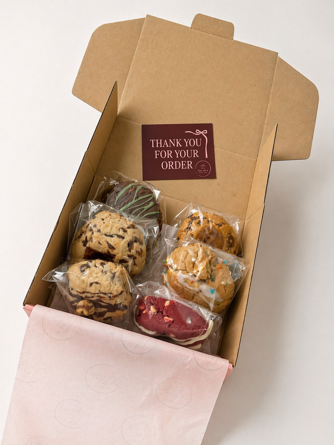 A delicious selection of six bakery-style cookies—one of each flavour—featuring rich red velvet, gooey stuffed chocolate, caramel-filled indulgence, fun birthday cake, luxurious pistachio crunch, and a classic walnut choc chip. Soft, decadent, and full of variety, this box is perfect for sharing (or not!).