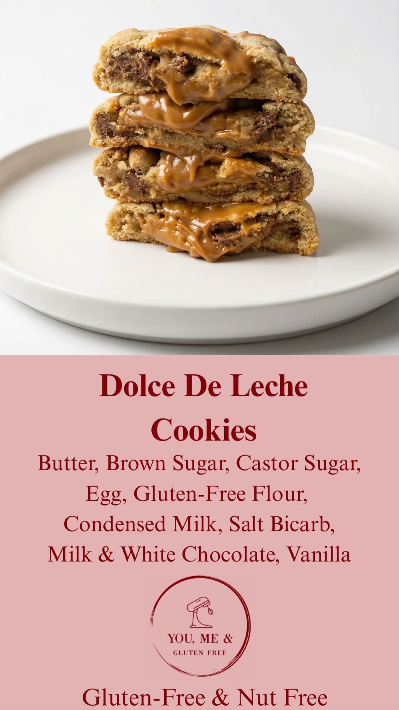 Sweet, buttery cookies infused with luscious caramelised condensed milk and pockets of milk and white chocolate. Soft in the centre with golden edges—pure melt-in-your-mouth comfort.